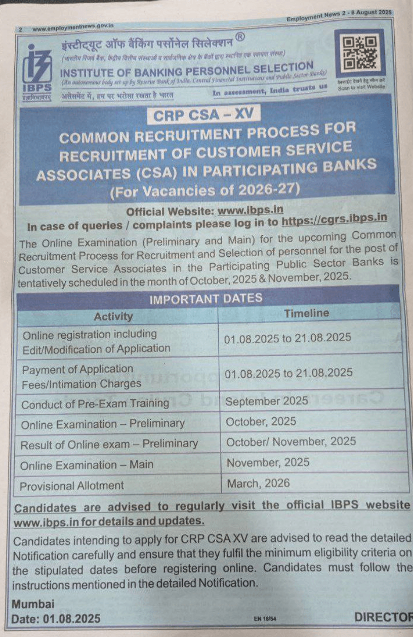The Institute of Banking Personnel Selection (IBPS) has issued the short notification for IBPS Clerk 15th Recruitment 2025, officially termed CRP CSA-XV, aimed at filling clerical positions in 11 public sector banks. The online application window opens on August 1, 2025, and closes on August 21, 2025.