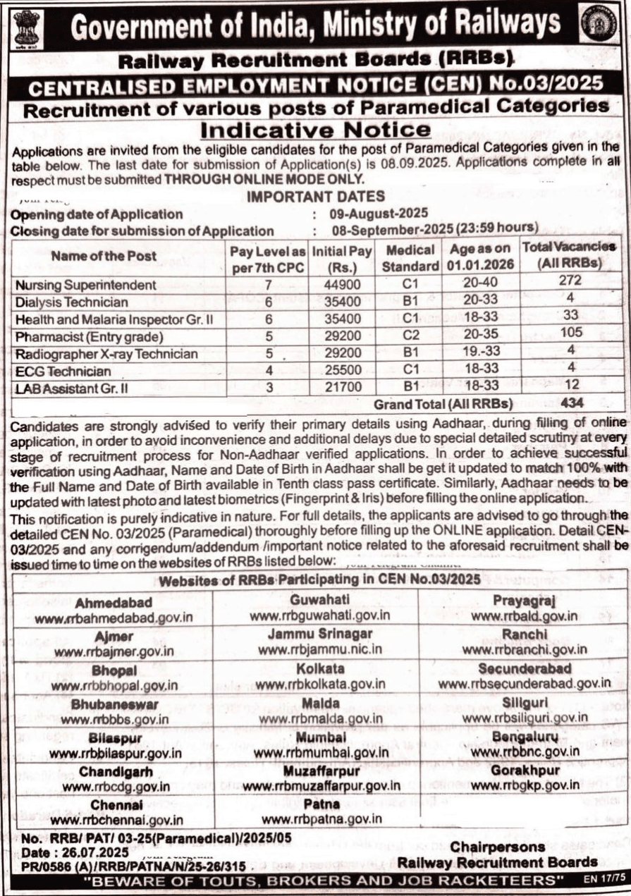 Railway Recruitment Board (RRB) Paramedical Staff Recruitment 2025 Short Details of Notification SarkariJob.Com